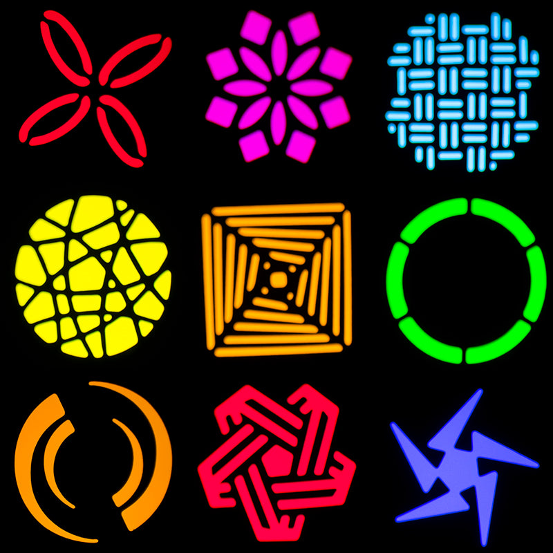 roată de efecte deschisă : două prisme cu efect, una cu rotație șase prisme, una cu rotație cu cinci prisme cu efect de mișcare